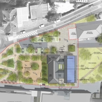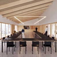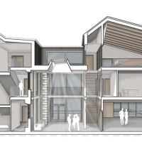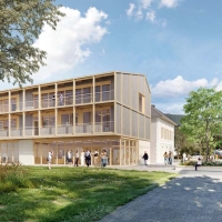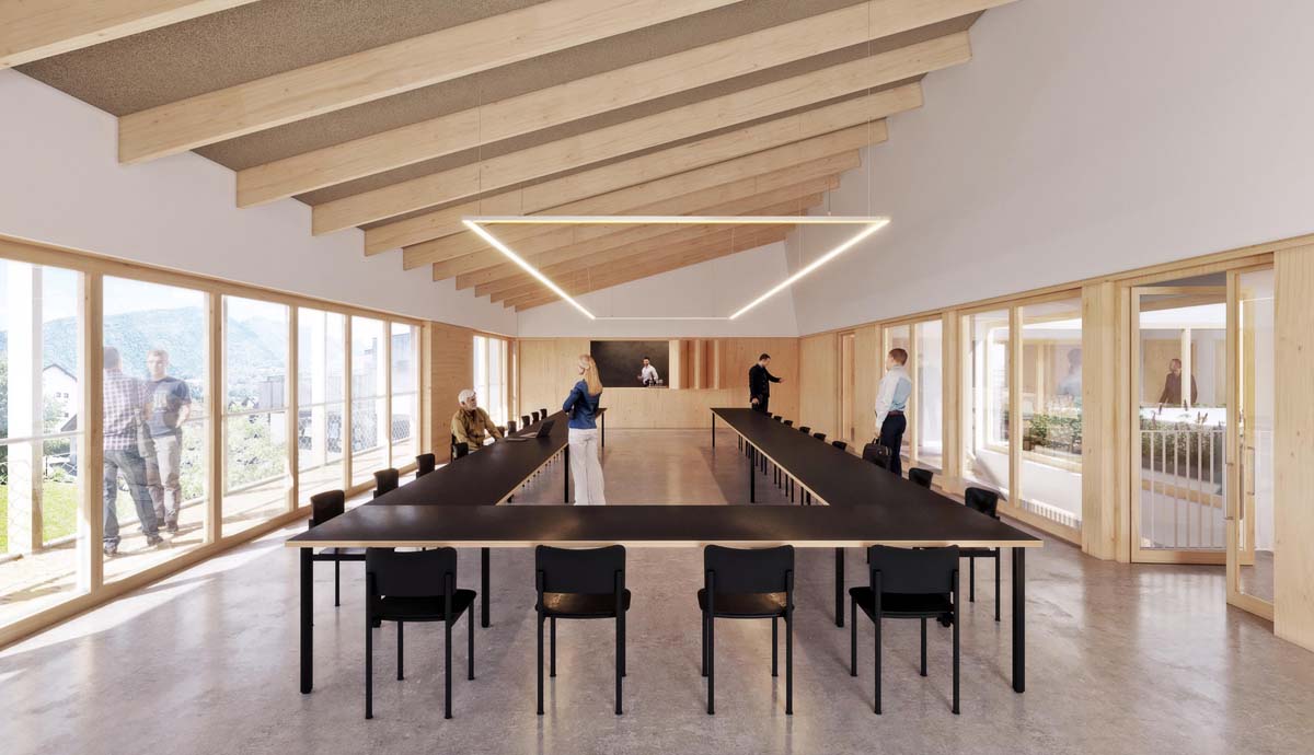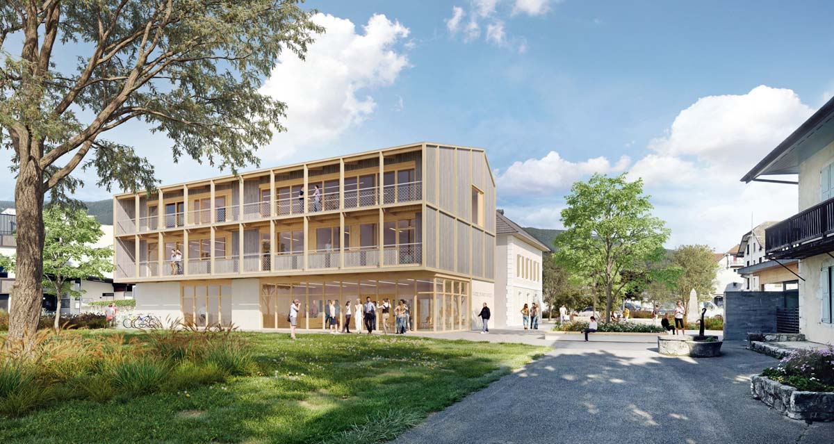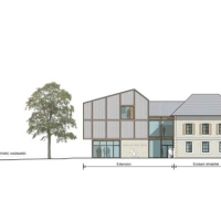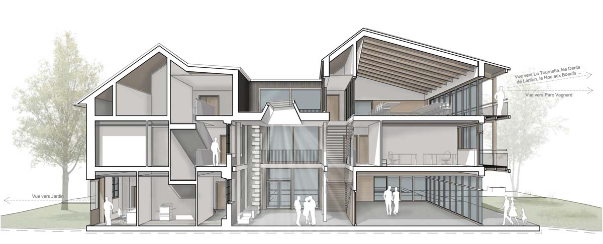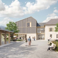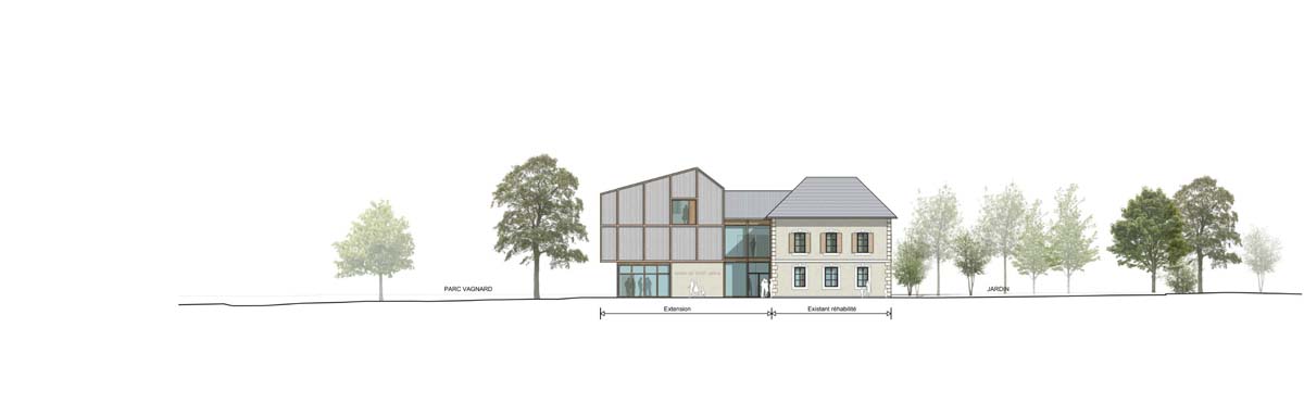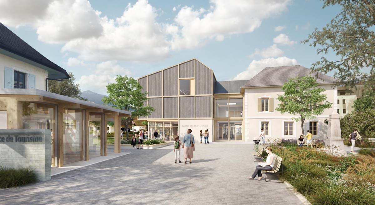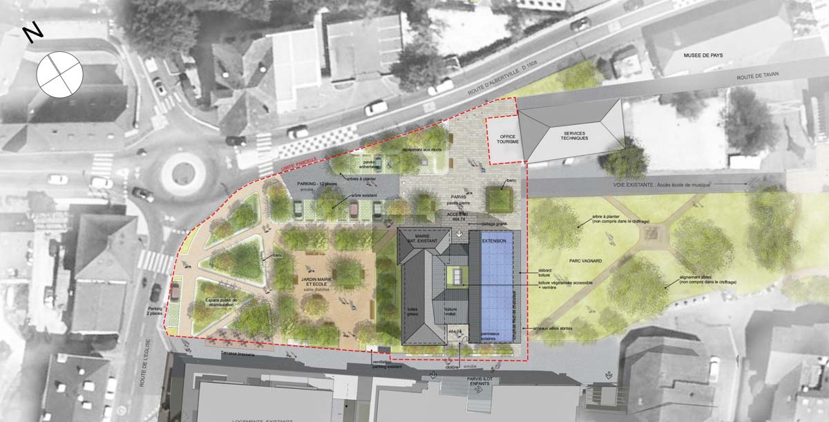 Le projet de restructuration et extension de la Mairie et de ses abords revêt une dimension urbaine susceptible de renforcer sa lisibilité et son fonctionnement au sein du cœur du centre-bourg tout en offrant des espaces publics valorisés et diversifiés. L’extension dialogue avec les composantes du lieu : vues sur le grand paysage, ensoleillement, trame urbaine et paysagère, maillage des cheminements... Les volumétries proposées se caractérisent par une simplicité formelle, dynamisée et animée par le jeu des toitures et le rythme des ouvertures. Cette composition, articulant bâti existant et extension par le biais d’une faille vitrée, préserve la lisibilité de l’ancienne mairie, valorise sa dimension patrimoniale tout en offrant des espaces intérieurs baignés de lumière par le biais d’un patio.