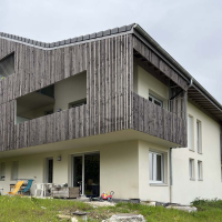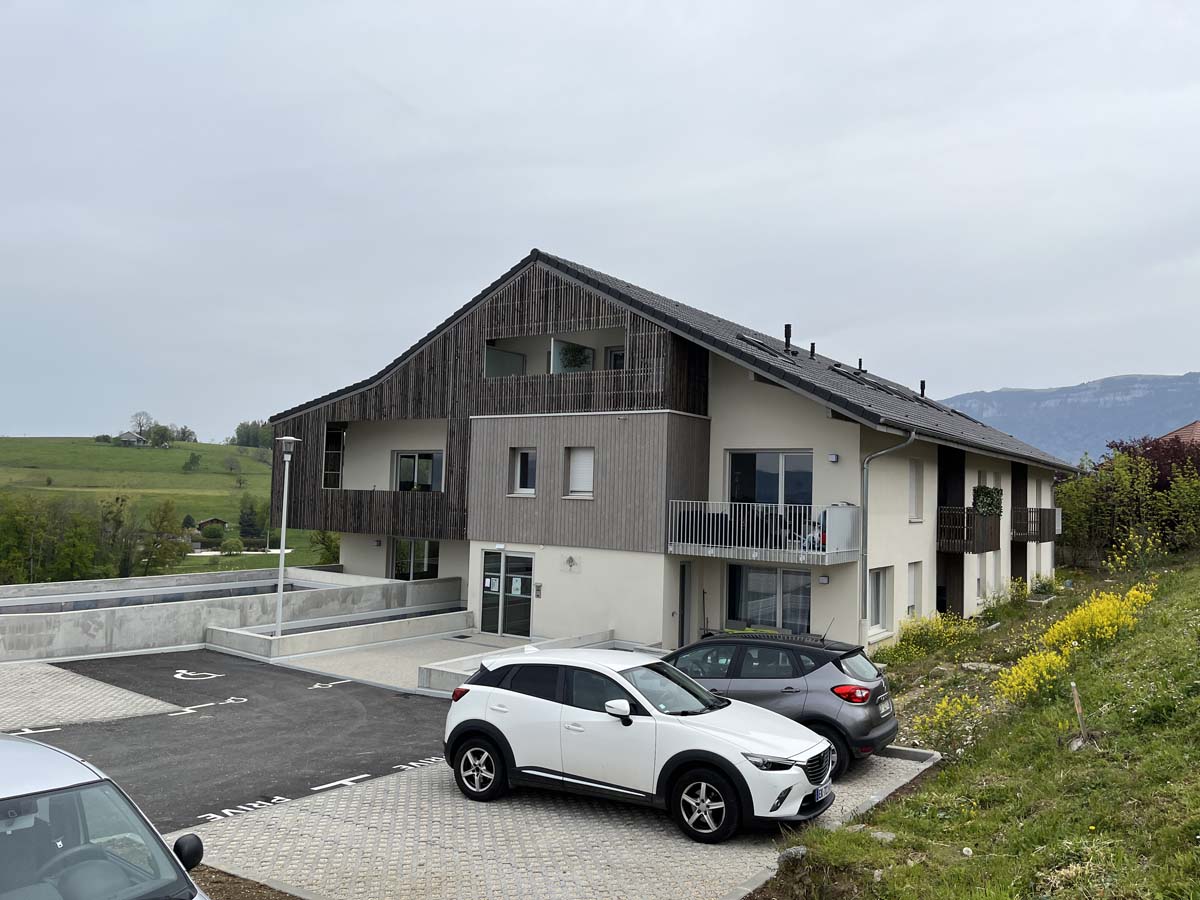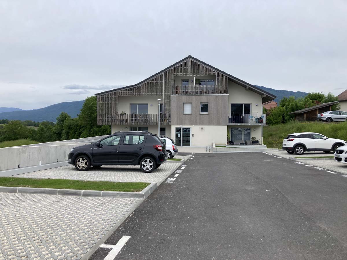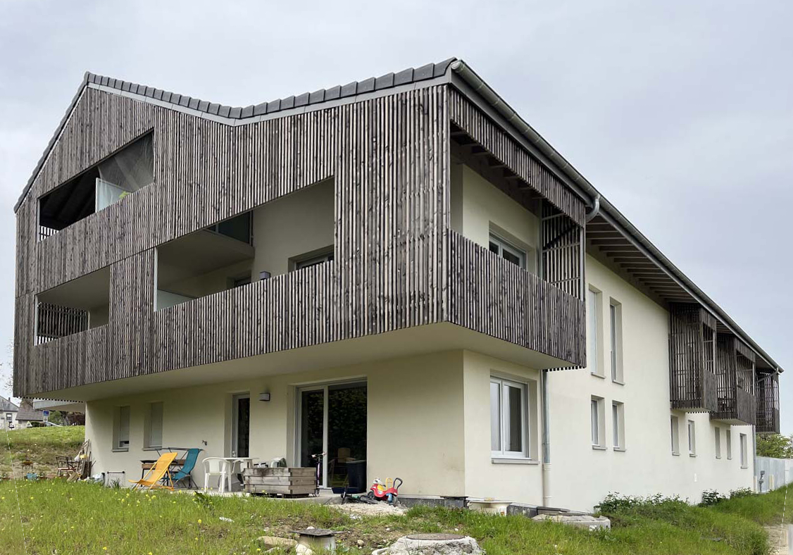 Le parti pris architectural et paysager s’oriente donc, à l’image des constructions traditionnelles, vers les notions de simplicité et de mesure en respectant le caractère bucolique du site. Une résille de bois ajourée. participe à intimiser les balcons du collectif et à formaliser des belvédères captant les magnifiques vues ouvertes sur le Grand Paysage.