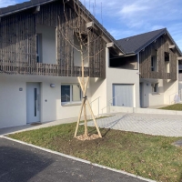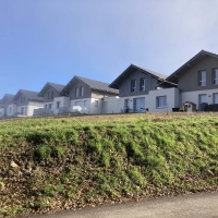 Irrigué par une voirie parallèle à la pente, le plan de composition s’organise de manière à poursuivre le tissu urbain existant en amont du site : les 8 maisons finalisent la tissu pavillonaire existant alors que le bâtiment collectif s’installe en contrebas du bâtiment collectif existant.