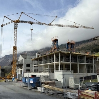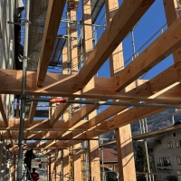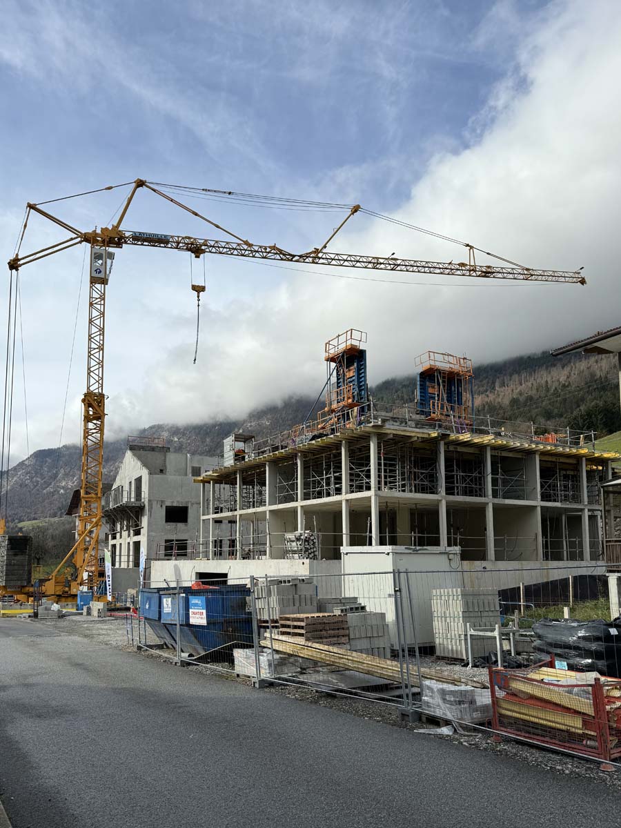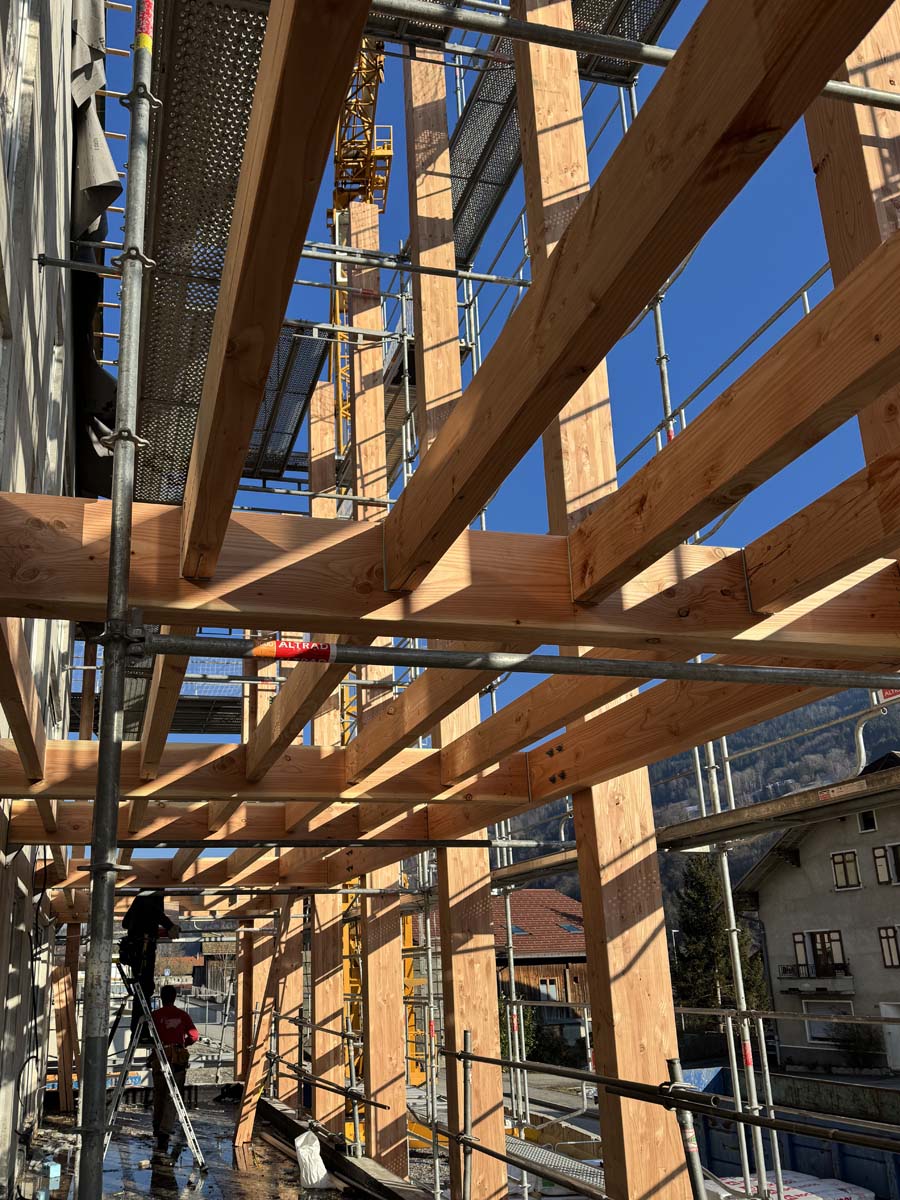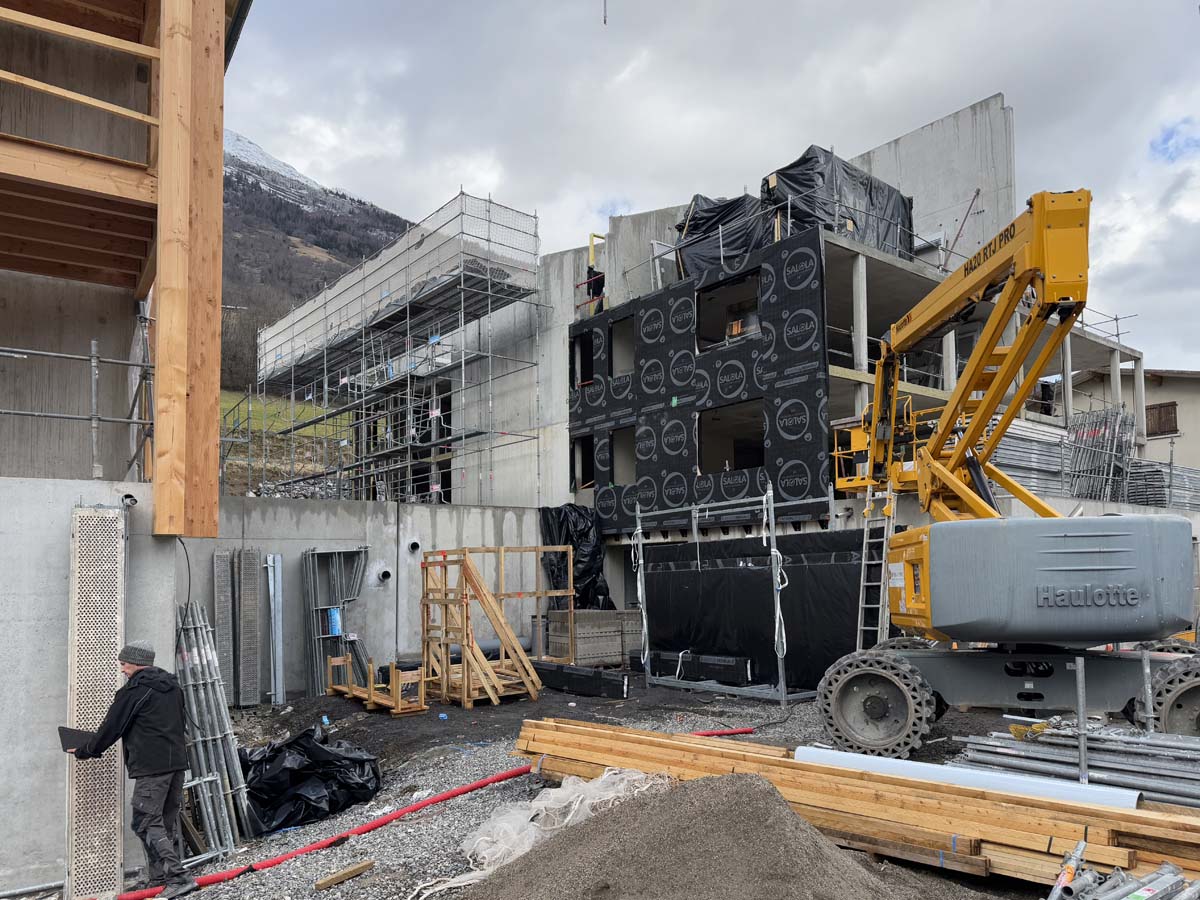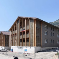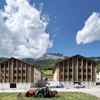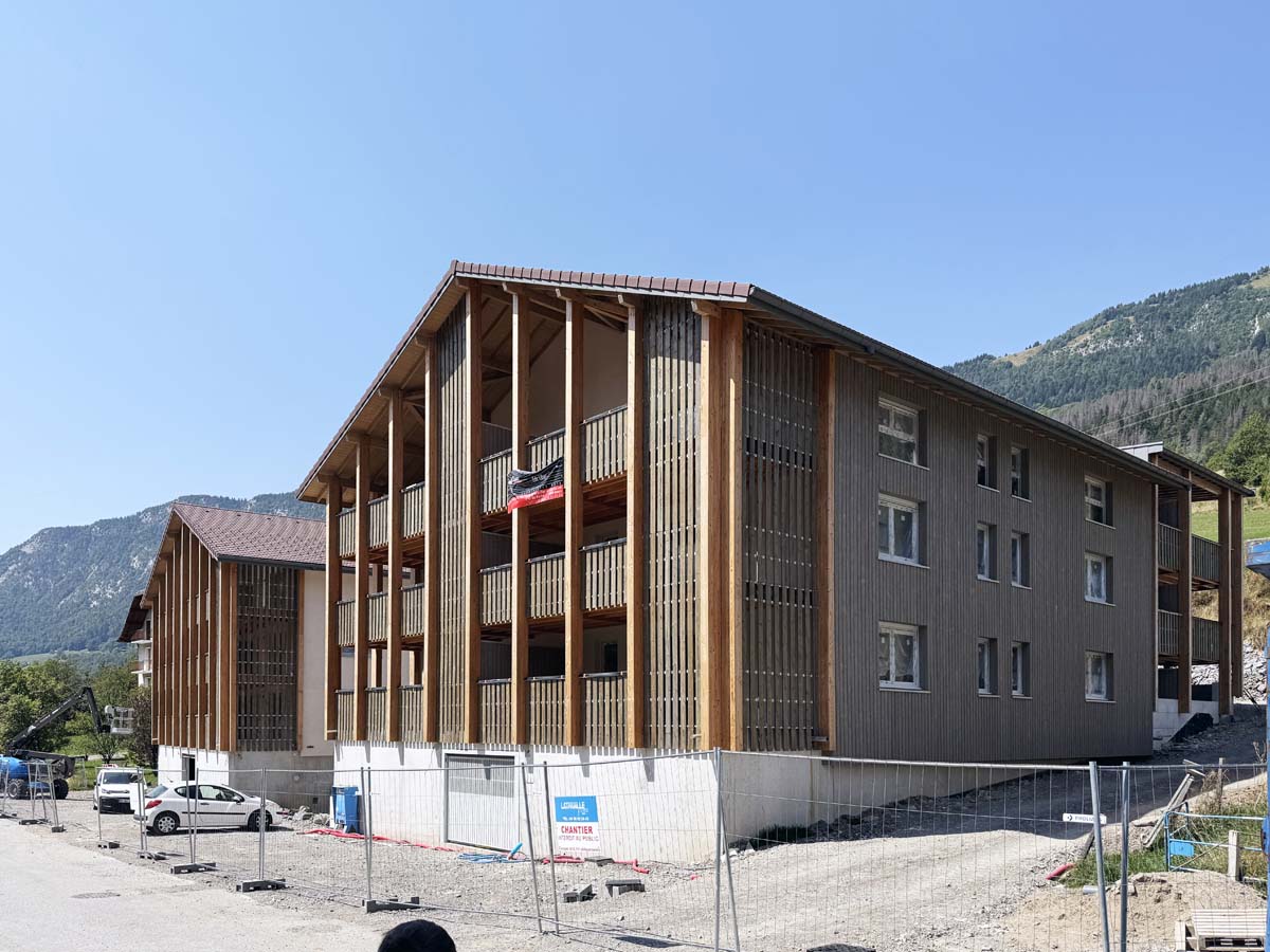 L’organisation du plan d’ensemble met à profit la topographie naturelle du site, caractéristique majeure de celui-ci. L’implantation des 2 bâtiments, perpendiculairement aux courbes de niveaux, permet, tout en séquençant le front de rue, de créer une perméabilité entre les bâtiments et de favoriser le maintien de la topographie du terrain naturel. La volumétrie générale des bâtiments repose donc sur un socle semi enterré qui permet l’accès de plain-pied aux parkings enterrés, aux garages à vélos et aux halls d’entrée depuis la rue, point bas du site. Réalisés en ossature bois et revêtus partiellement de bois, ils revisitent le langage traditionnel des constructions traditionnelles agrémentées de balcons qui valorisent les vues ouvertes et dégagées sur l’Est et l’Ouest. Le rythme vertical de la structure et celui de l’habillage se répondent et contribuent ainsi à dynamiser les façades.