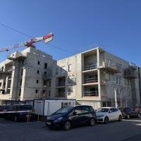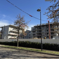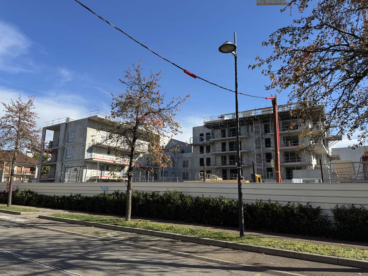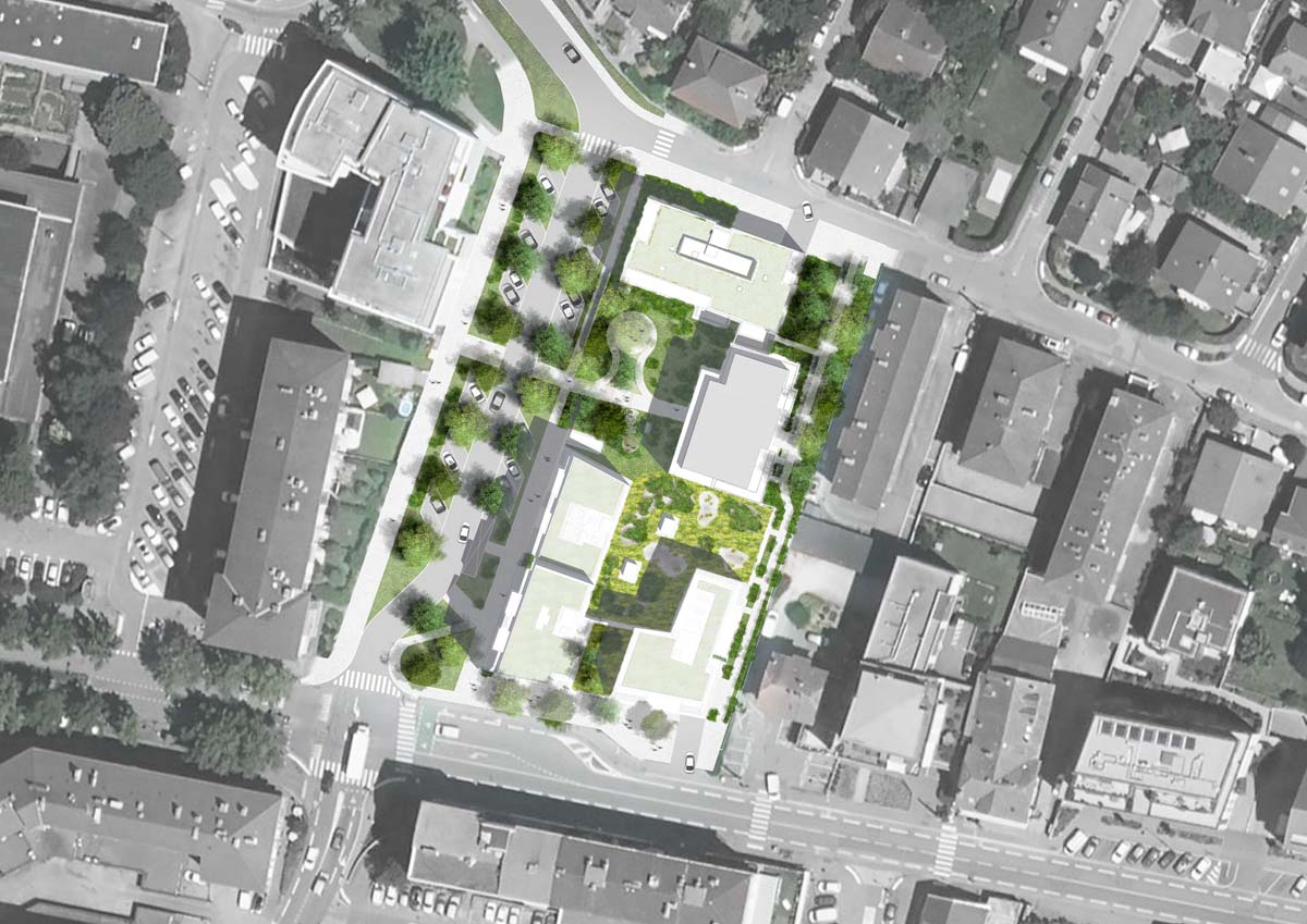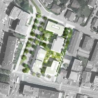 A la croisée des zones urbaines et pavillonnaires, l’opération ambitionne une requalification de ce secteur offrant aux futurs habitants, ainsi qu’aux riverains, un projet cohérent, qualitatif et vertueux au regard des enjeux urbains, paysagers et environnementaux. L’implantation du bâti s’organise à partir de 2 ensembles générant d’un cœur d’îlot paysager permettant la transparence et les percées visuelles. Le 1er, composé d’un socle commercial qui supporte 3 bâtiments, formalise un front de rue, séquence et anime cette densité assumée. Le second ensemble bâti s’installe quant à lui selon le principe de l’îlot «ouvert», autour d’un vaste parc paysager en cœur d’îlot. Ces gabarits plus modestes permettent le lien avec le tissu pavillonnaire voisin.