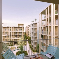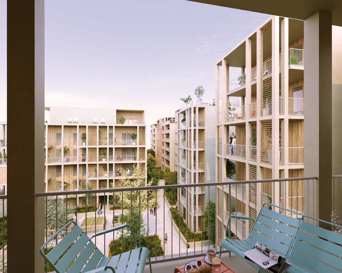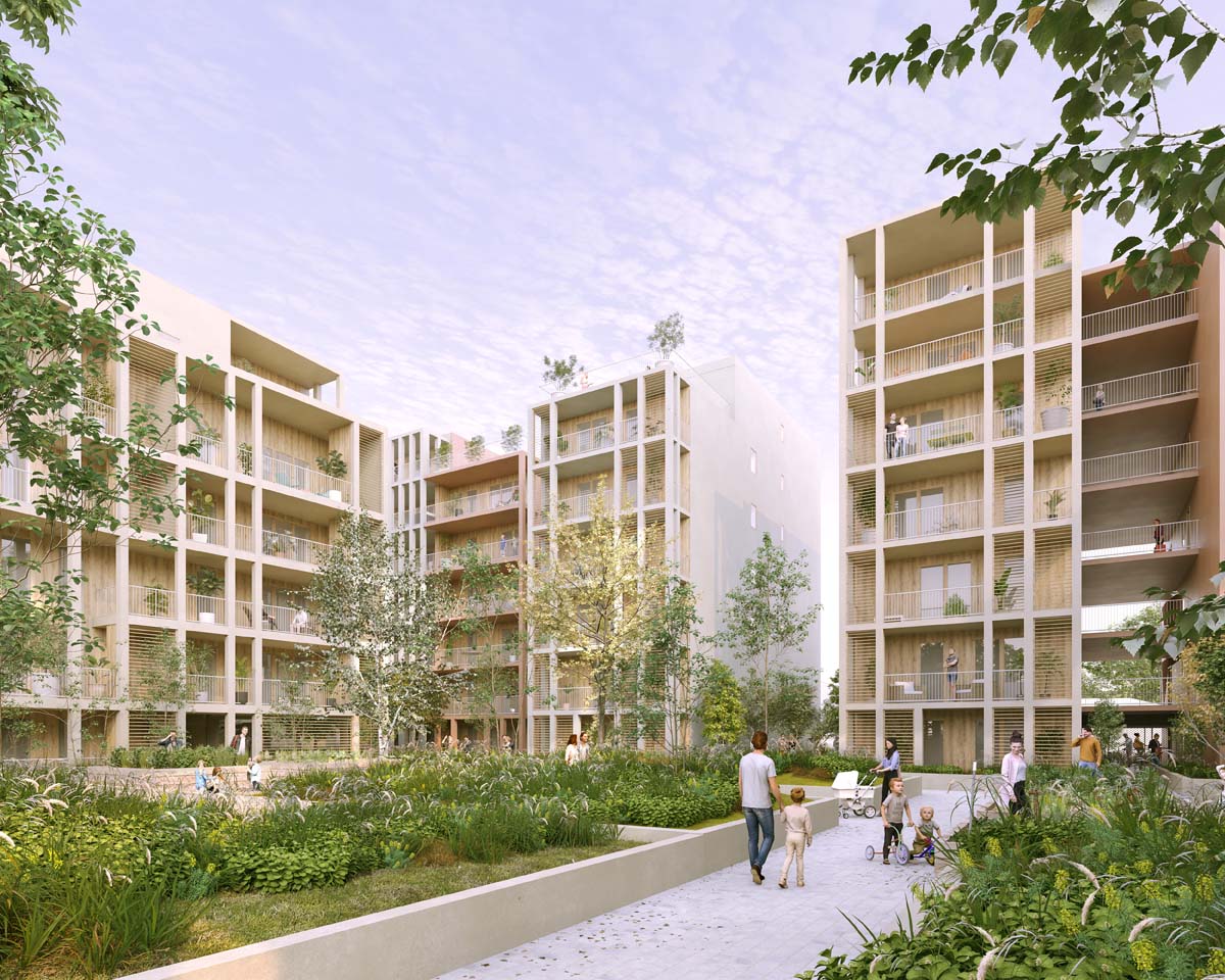 Un vaste parc paysager s’installe alors au Sud, selon le principe de la cité-jardin, irrigué par de grandes traversées piétonnes urbaines connectées au quartier.