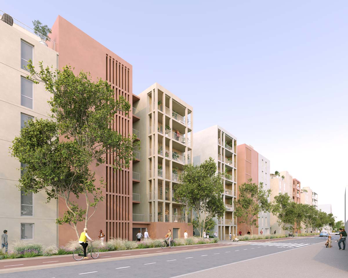 Le front de rue se formalise par une succession de plots verticaux séquençant ce dernier et introduisant une porosité bâtie libérant ainsi les vues sur le coeur du tènement.