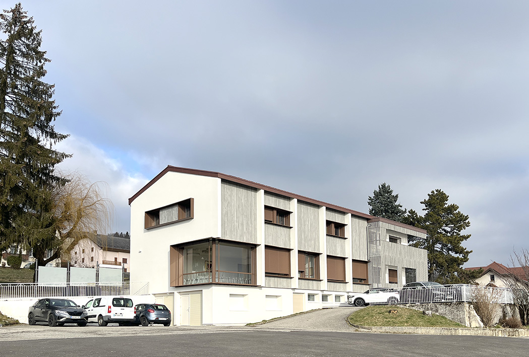 La restructuration, la rénovation énergétique du bâtiment de la mairie et sa mise en accessibilité offre l’opportunité à la commune de repenser son identité architecturale, de renforcer son caractère institutionnel et sa lisibilité au sein de son territoire. Installés en signal, la large baie d’angle créée dans la salle des mariages ou le volume de bois en saillie de la façade Sud valorisent les vues sur le Grand Paysage pour dialoguer avec ce territoire commun. Bien que contrainte par une faible hauteur sous plafond de l’étage, la salle du conseil bénéficie désormais d’une importante hauteur sous plafond grâce à la démolition d’une partie de la dalle des combles qui offre alors une espace de représentation à la hauteur de son statut.